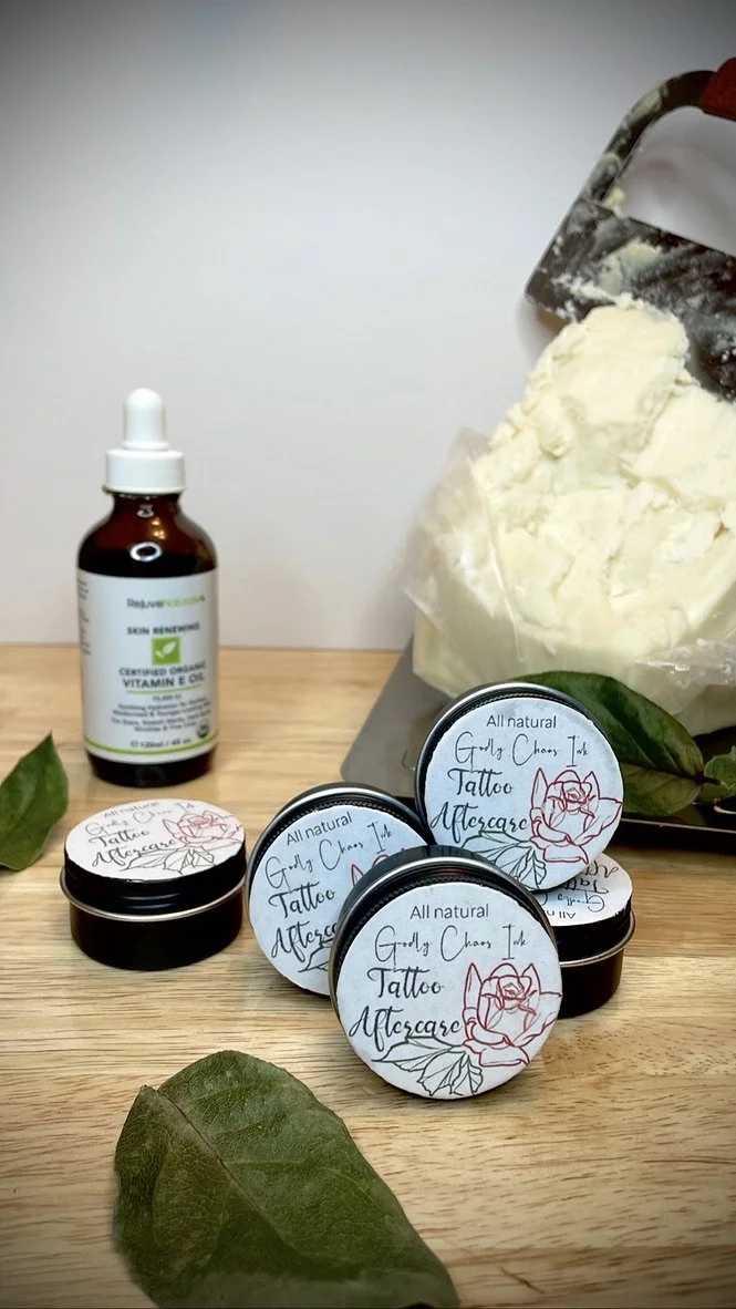 Apply a thin layer of our all Natural Shea Butter Tattoo Aftercare as needed on the tattoo, about 3 - 4 times a day. I think Shea Butter based products work best to ensure a seamless healing process. vaseline and Aquaphor make a barrier over your new tattoo to help stop germs and bacteria from getting in, but doesn’t soak into the skin and deeply moisturize as well as shea butter. You want the tattoo to stay moisturized but also allow it to breath.